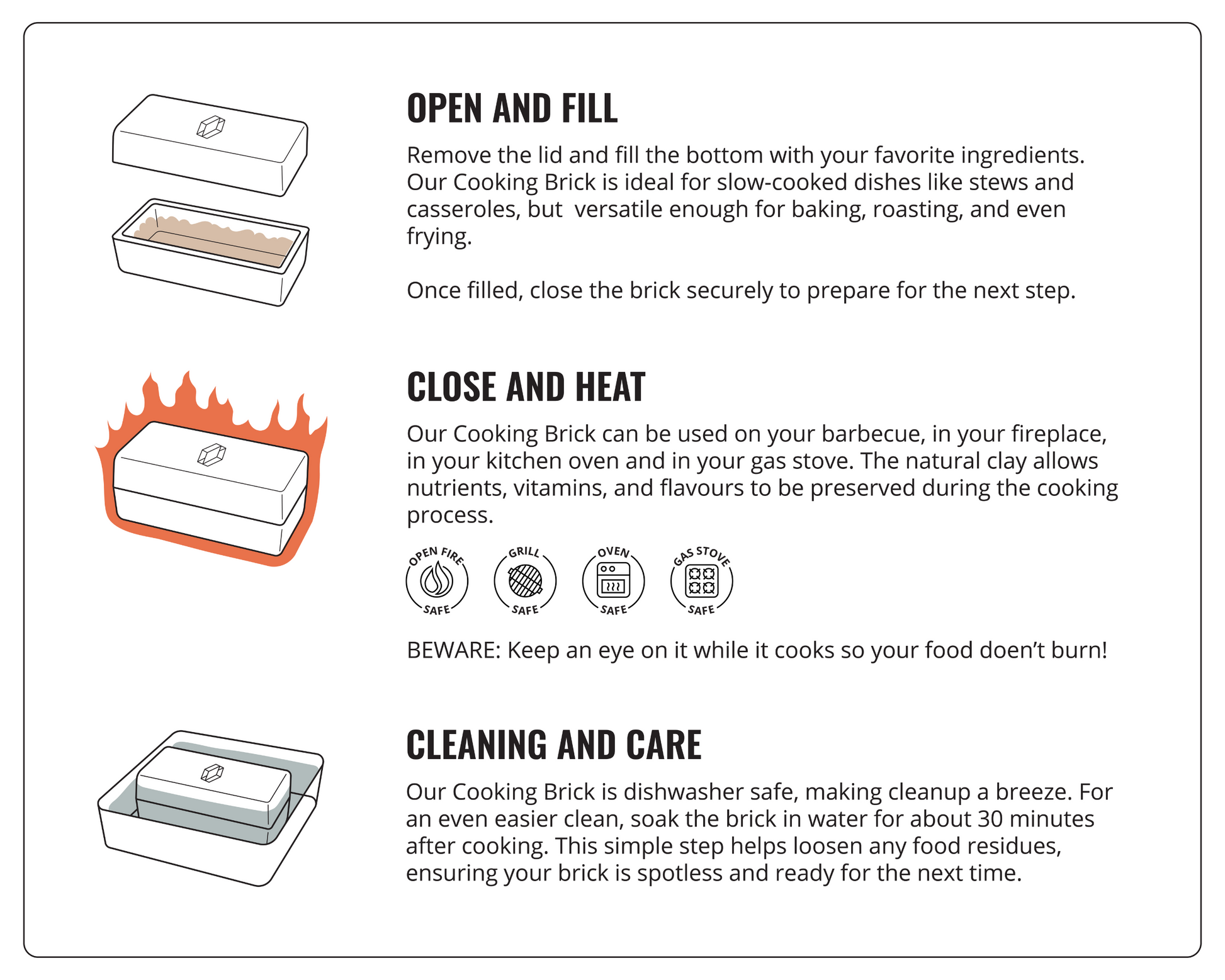 A versatile, easy-to-use cooking (bbq) tool. Just chop up your favourite ingredients, put them in the Brick and place on any heat source. A delicious dish is ready in under 30 minutes. Made of natural heat resistant clay, it’s nourishing too, locking in nutrients, vitamins and pure flavour.